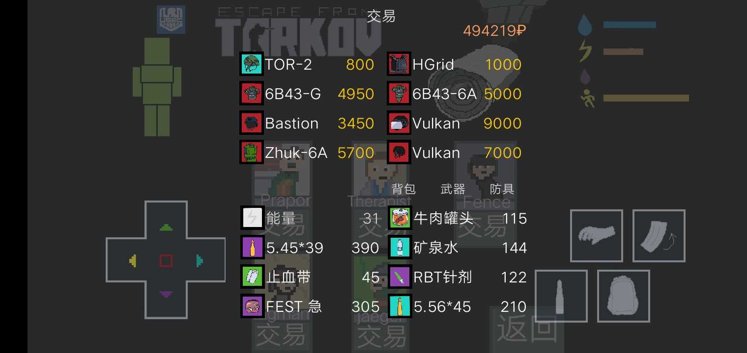 逃离塔科夫自制版1.6 更新内容:1.物价调整,所有护甲涨价500%,2.新头盔:带面甲的Vulkan头盔,3.二把新钥匙,符号钥匙和军用仓库钥匙(不能在市场上买),4.一大堆变卖物,红:显卡,情报,固态燃料,闪存模块,绿电池,金:游戏机,5.物品图标优化,6.打药时间及打药动画,优化了RBT针剂(绿针)使用后获得的BUFF,7.爆率提高,8.宝箱任务:击杀精英人机后100%掉落一本日记,提交日记获得宝箱,宝箱开启后可以获得随机物资:实验室凭证、电子卡、幸运币,幸运券等各种物资,幸运币&券,用于抽奖或兑换其它高级物资,例如冰镐和信号棒。...还有一大堆东西,(东西太多记不住了)。提示:版本更新后可能会出现以下问题,物资点&实体位移,卡顿,按键失灵等