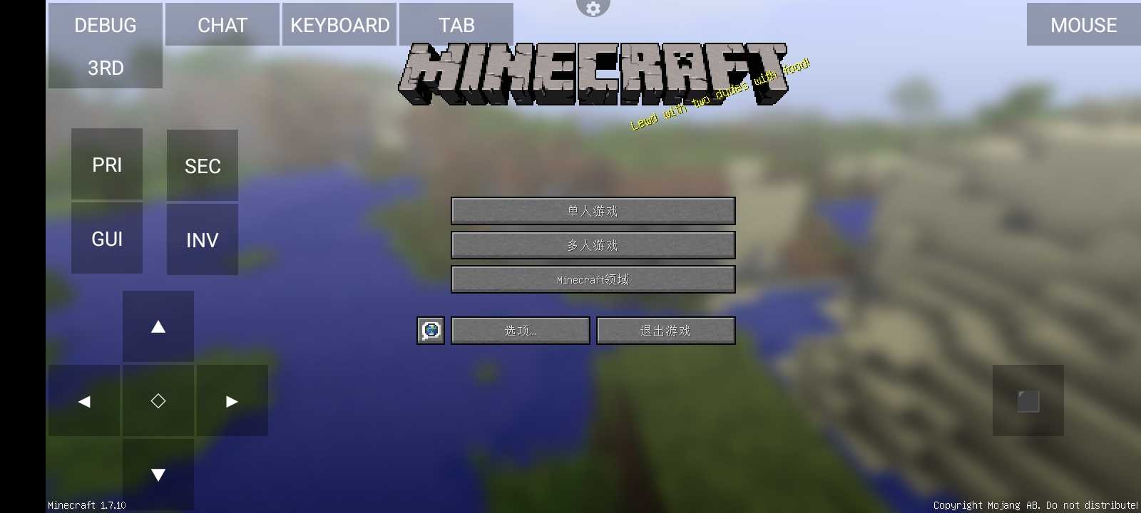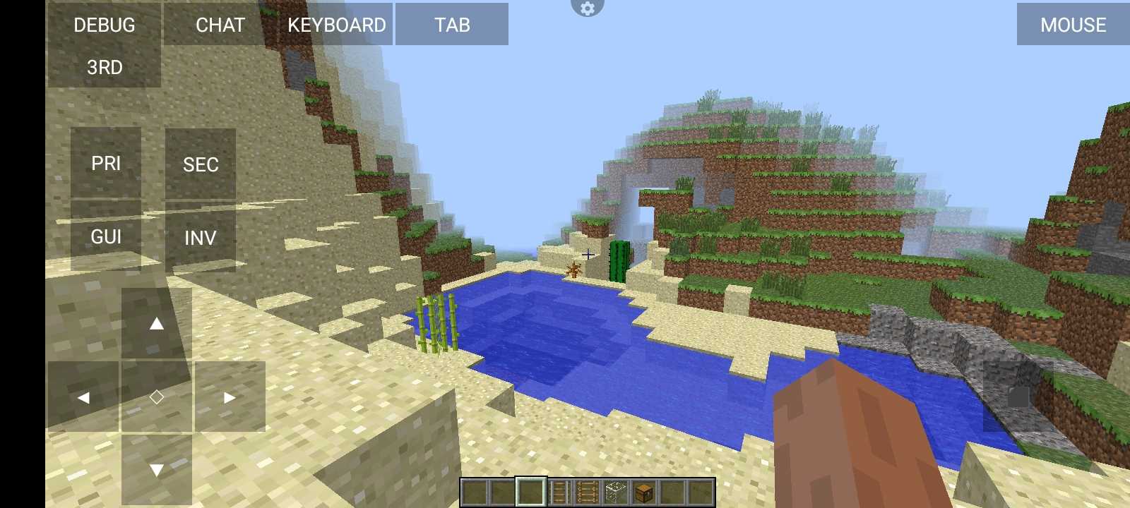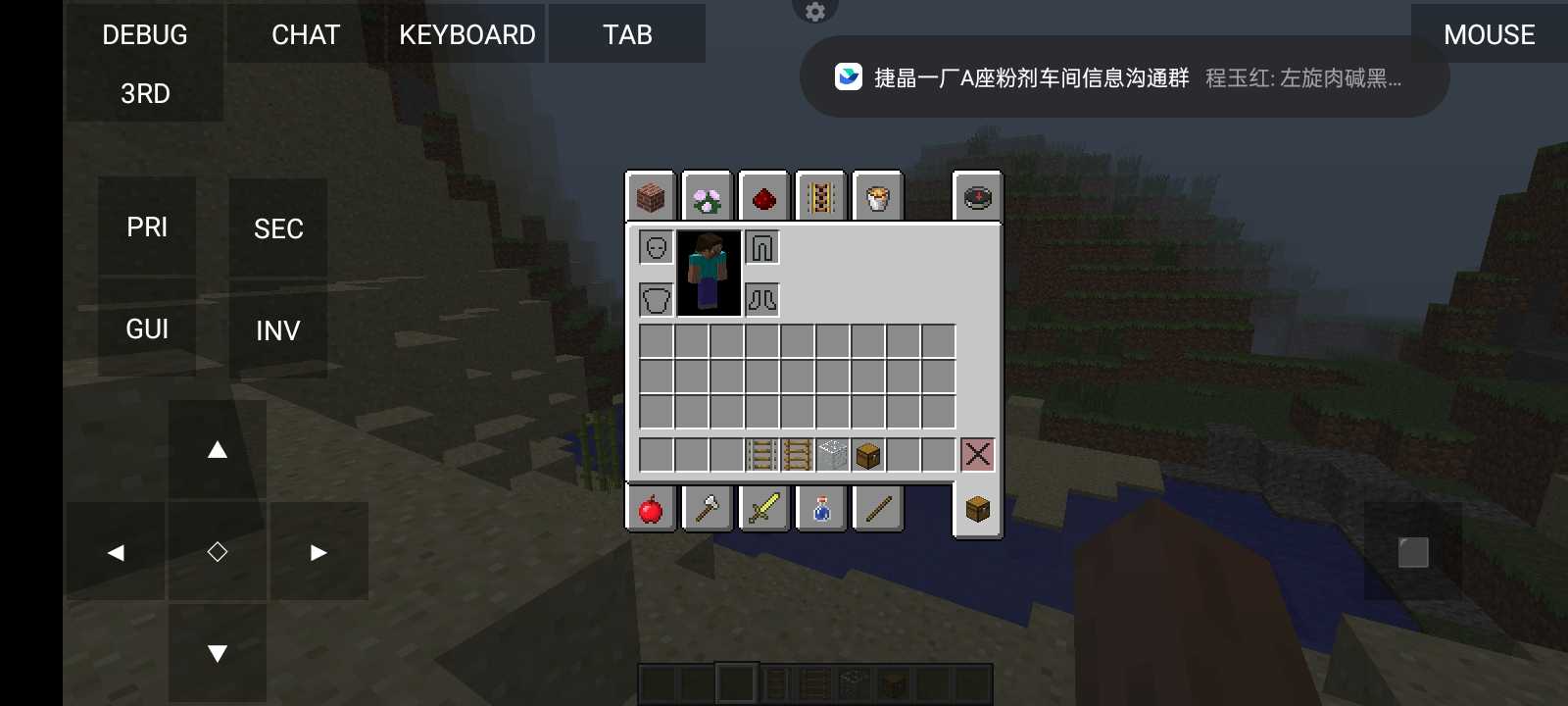 操作指南(为了能让大家看清,所以我就把那四个放在移动键上面了):第一个键是攻击(破坏),第二个键放置(驯服生物),第三个是关闭按键,第四个是打开背包,破坏和放置可以自己在屏幕上点,但是那个十字要对准