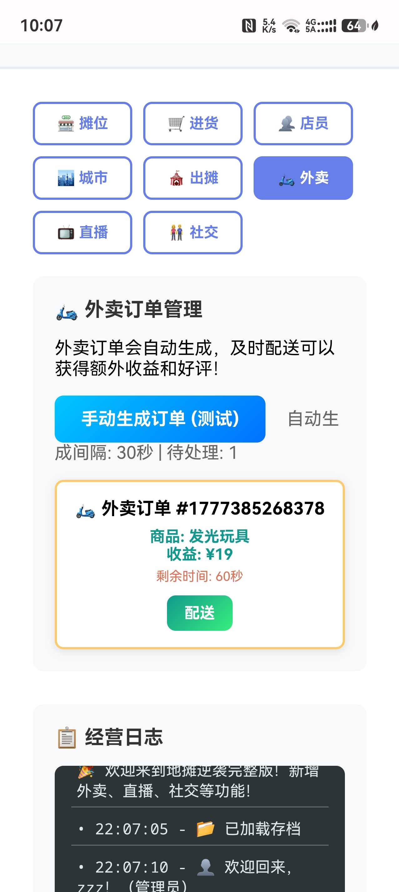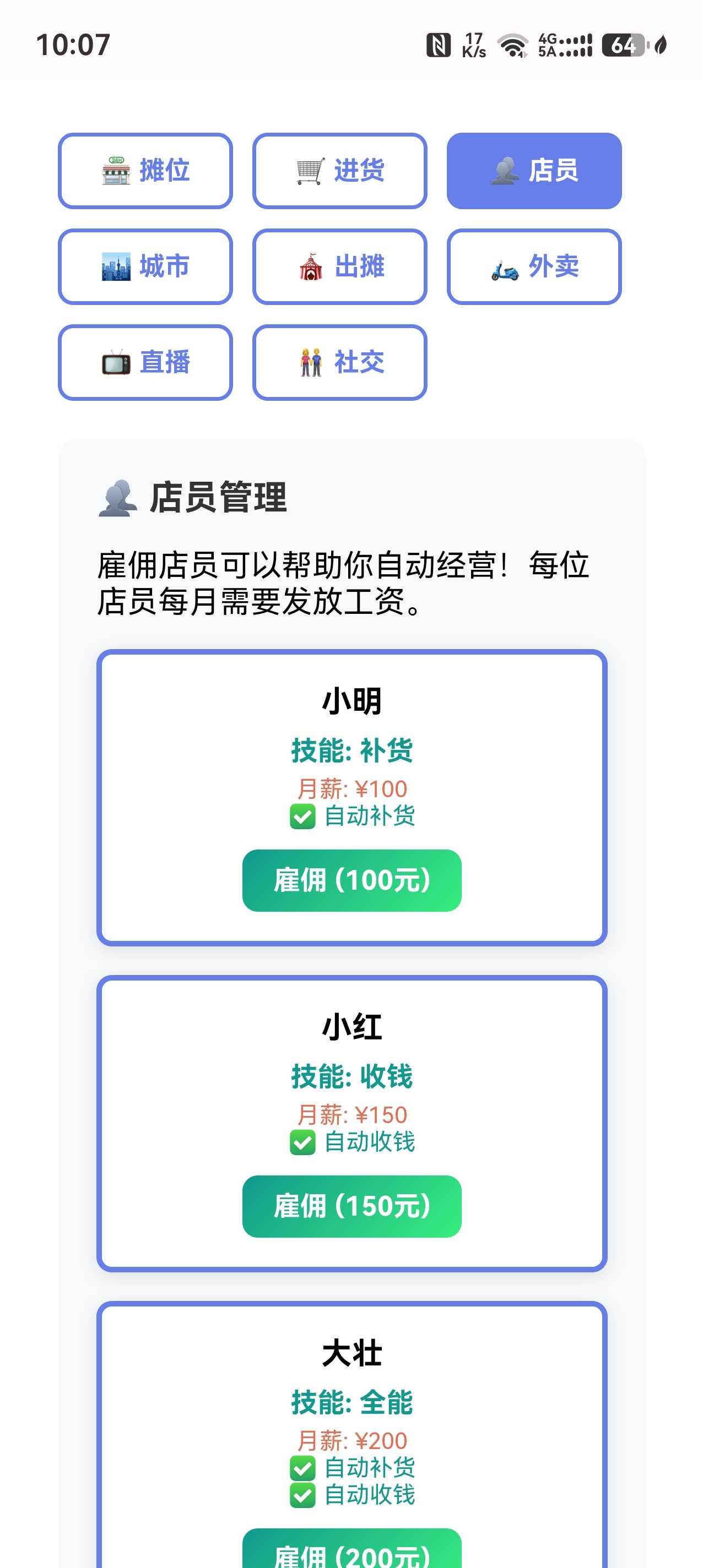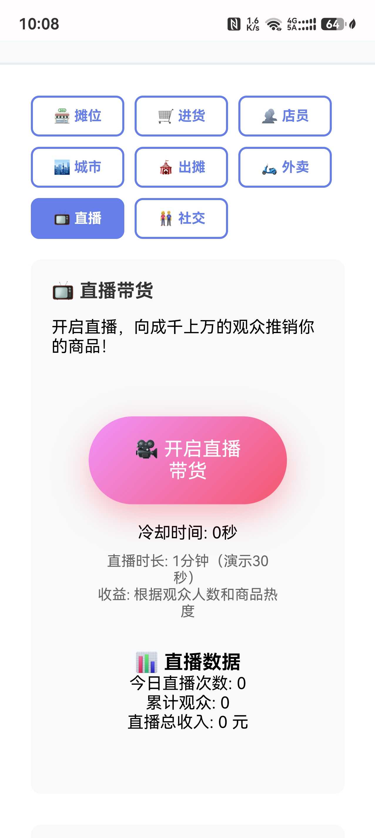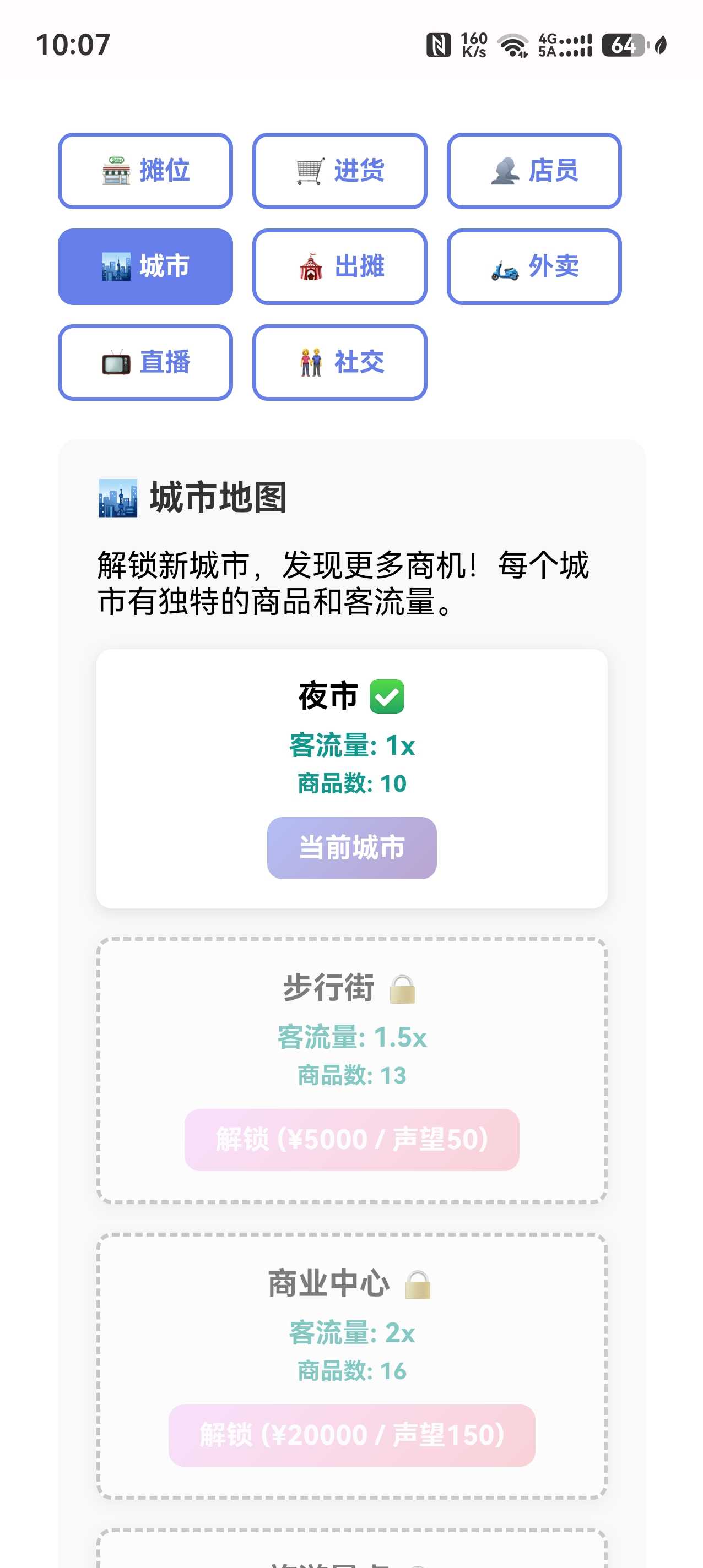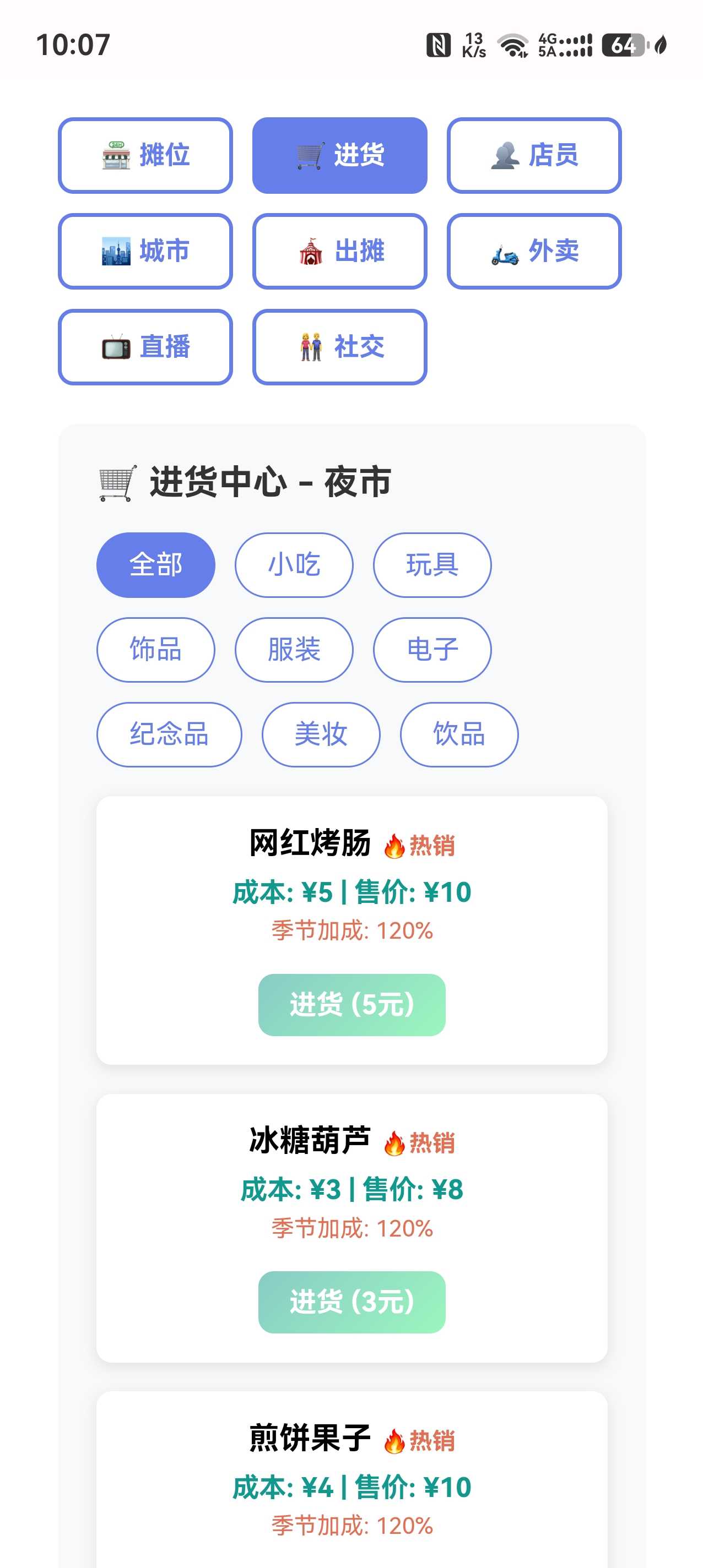 核心玩法 开局只有少量本金,摆摊卖小吃、饰品、玩具,赶集赚钱 积累资金后升级摊位→小店→连锁店→网红商圈 解锁不同城市集市、夜市,换季更换热销商品,低买高卖赚差价 招募店员、开通外卖、直播带货,从地摊小贩逆袭成商业大佬