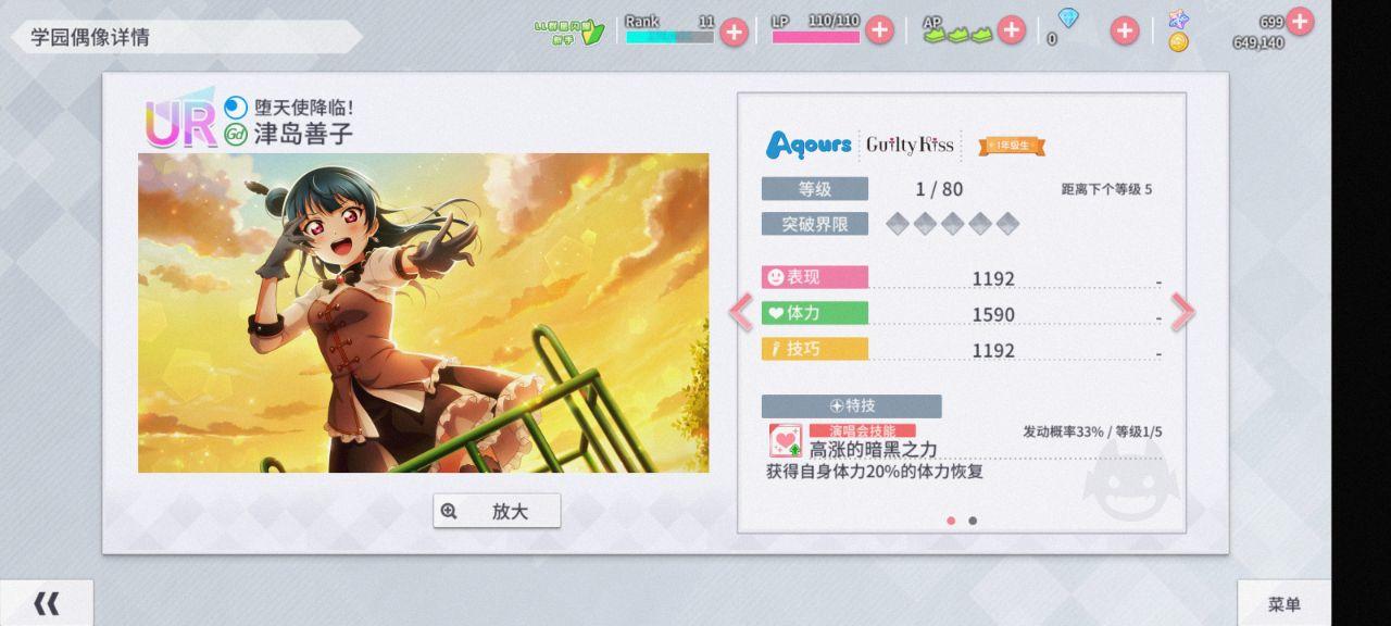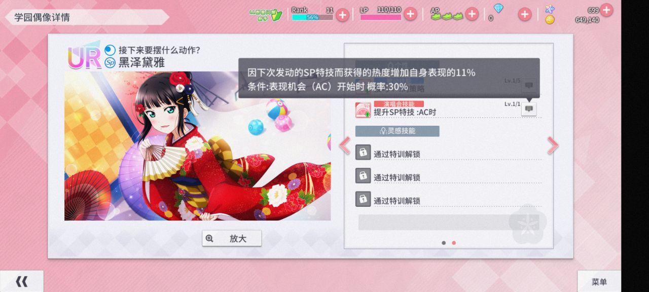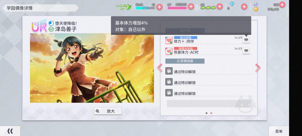 【技能解析】:特技效果为提升sp特技的热度值,被动是提升全员技巧,如果大家有幽灵公主善子提升大招能量收集效率,这位角色还是可以作为后排培养起来。