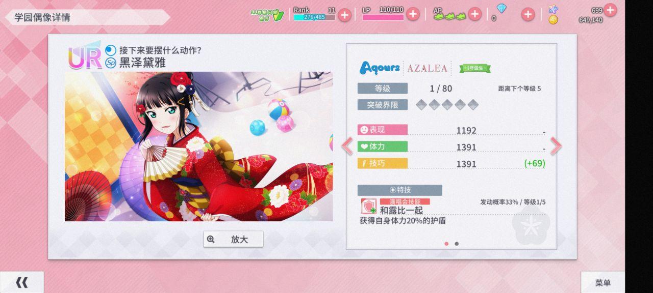 【面板解析】:作为Gd类型的偶像,基本体力还是合格的,不过表现与技巧略低,但本身就是一张后排卡,所以影响不大。