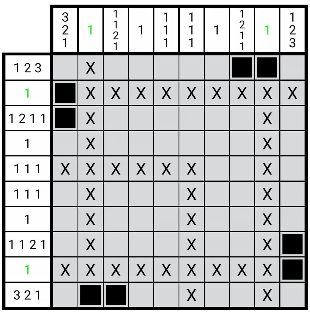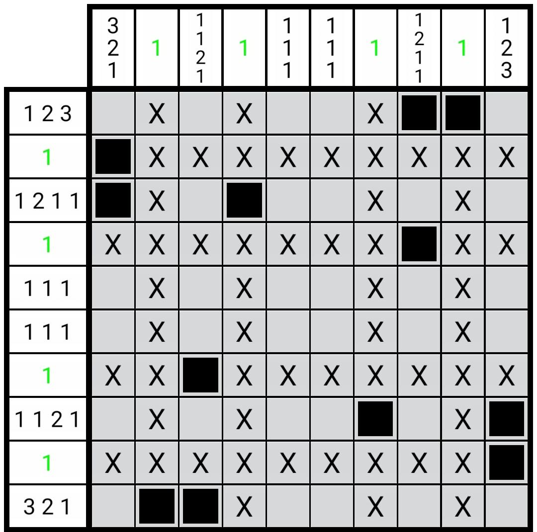 至此,我们可以开始简单的推理了,第1,10行,第1,10列推理可得数字3和数字2的位,同时也解决了数字1的位。完成后第3,7行,第3,7列只剩一种可能性了,也可以推出。至此所有条件成功满足,即本谜题完成。下图为结束图。