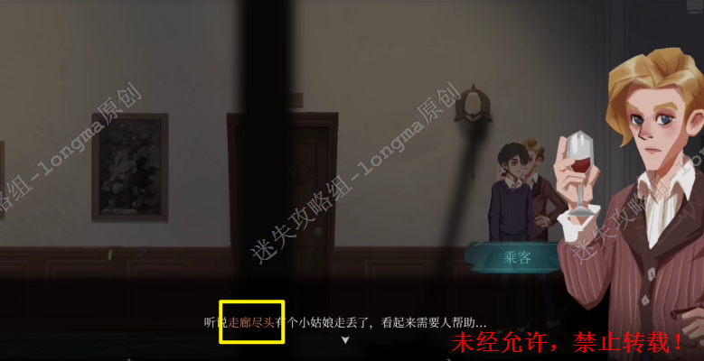 15.和前面的乘客对话,得到小女孩在走廊尽头,向右直行来到401房间右边找到小女孩玛奇朵。
