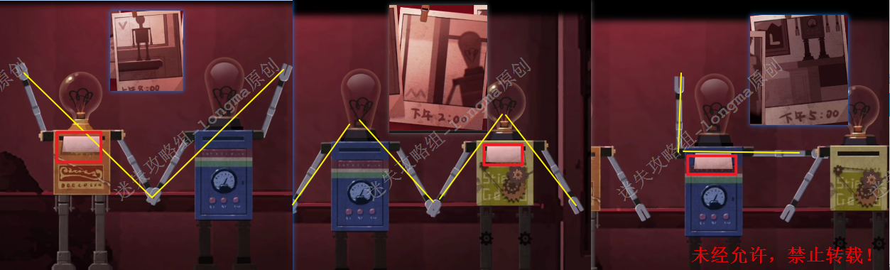 5.查看桌子上的三个小机器人,将亮灯的机器人手臂摆放成照片中字母的形状(字母的顺序对应照片上的时间,从早到晚),获得三张【相片纸】。