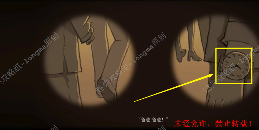 13.将【玩具熊的头】安装在右边地上坏掉的玩具上,将【小女孩照片】放在玩具熊的相框中,查看玩具熊亮起的眼睛,进入剧情,记住剧情中手表的时间(6:55)。