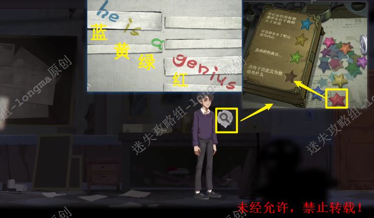 3.查看桌子右边的盒子,对照拼图背面的字母颜色,将对应的星星依次放入盒子上的凹槽中(蓝、黄、绿、红),打开盒子,查看线索纸。