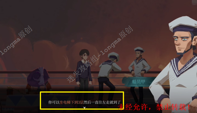 16.向右直行来到甲板上,和船员对话,得知需要坐电梯到3层,向左直走。