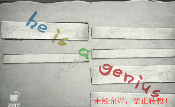 2.查看桌子上的线索,如图完成拼图(根据每句话的意思,将其放入对应的方框中,第一个为两行的空格,所以只能选择两行话的纸条,然后根据意思选择纸条),记住纸条背面英文的颜色。