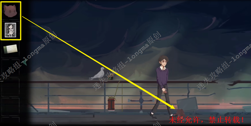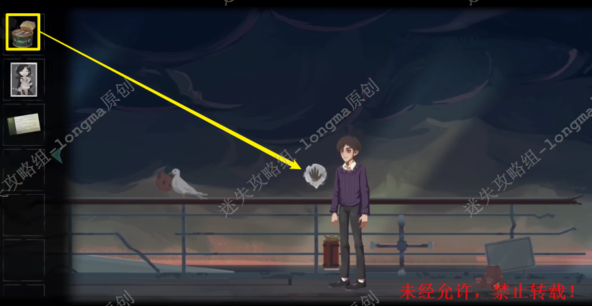 12.返回海鸟右边的栏杆处,将【打开的鱼罐头】放在栏杆上,拾取海鸟叼着的【玩具熊的头】。