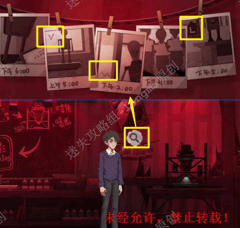 6.向左走到黑板处,查看工作台,依次将三张【相片纸】放入右边的夹子上,进入三段剧情。