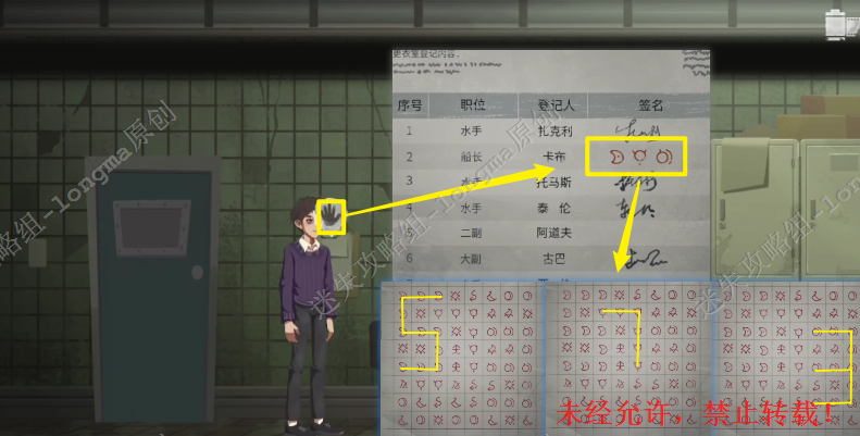 2.查看门右边墙上的登记表,记住“卡布”的签名,对照登记表背面的图表,将对应的图案进行连线,得到数字密码:573。