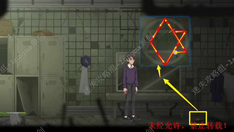 5.拾取镜子右边地上的【口红】,使用【口红】完成镜子中的一笔画小游戏(对照衣柜门上计算出的图案,一笔完成图案),进入镜中世界。