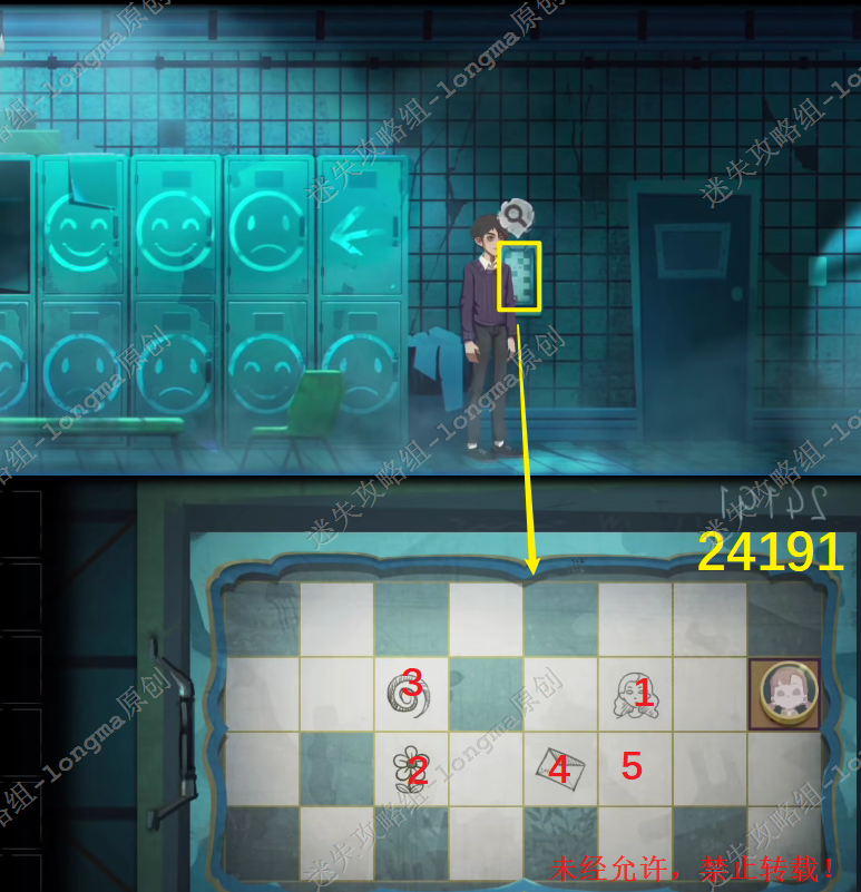 6.向右来到门口,查看墙上的棋盘,对照棋盘右上角的数字依次将棋子移动至对应的位置(镜中世界的数字和现实是反着的,所以正确数字是24191,每个数字代表的是移动的步数,通过观察棋子的移动轨迹,得出对应数字的步数棋子移动至的位置,依次点击这些位置),没移动一步,进入一次剧情。