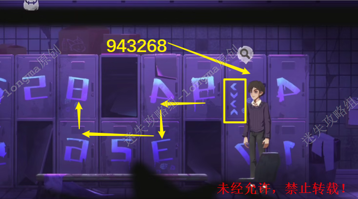 7.如图根据柜门上的箭头提示,得到柜门上的密码:943268(镜中世界的数字是反的),在有箭头的柜门上输入943268,打开柜子获得【铜色钥匙】。