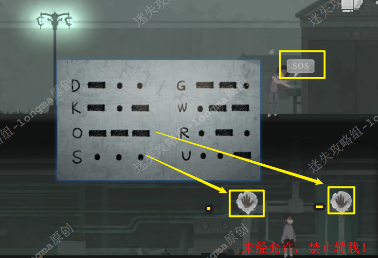 5.向右走到尽头,查看地下水管,对照摩斯密码表,使用【铁棍】敲击,左左左(S),右右右(O),左左左(S),传递出“SOS”的求救信号。