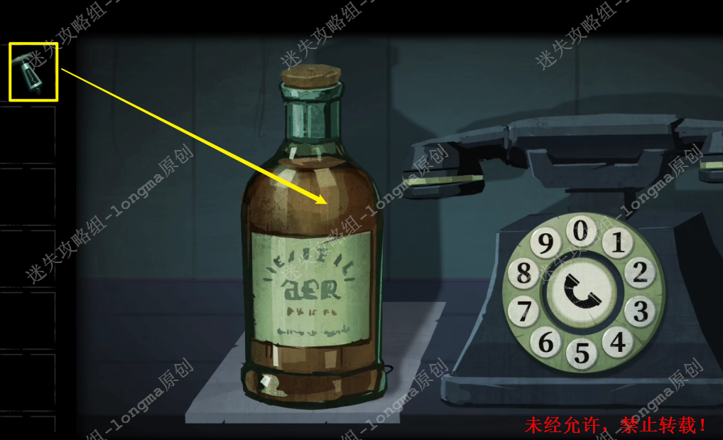 13.查看电话机,对玻璃瓶使用【开瓶器】获得【葡萄酒】,在下面的纸上看到酒精显色。