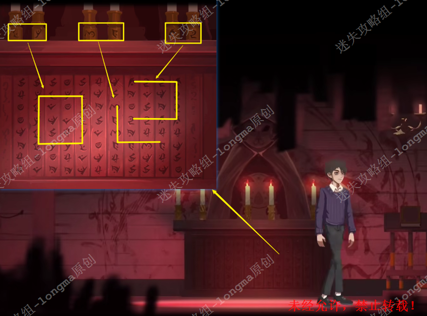 16.向左来到神案前,点亮蜡烛,查看下面的符号,对应三组烛台,将和每组烛台相同的符号连线,得到三个图案。