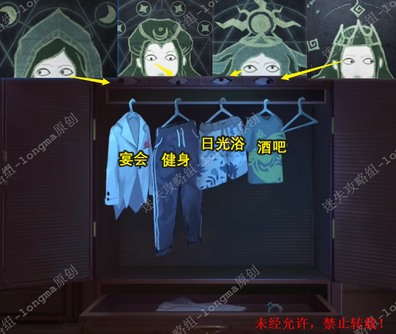 10.打开左边的衣柜,卡罗牌的眼睛对应衣柜上的眼睛,按照对应场合穿什么衣服的规律摆放衣裤,打开下面的抽屉,得到衣服线索和【男士戒指】。