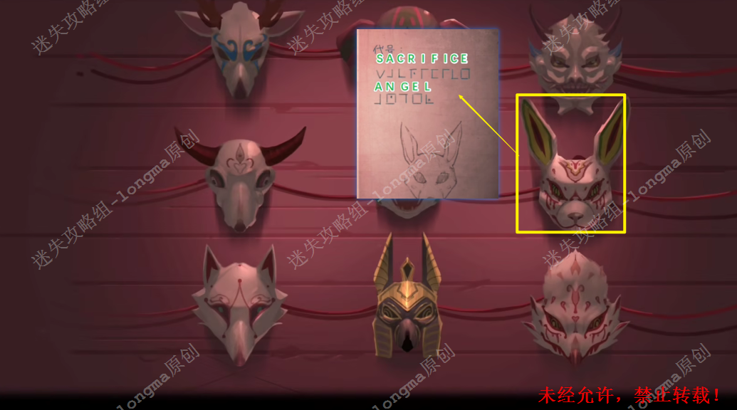 19.来到神案左边点击书中对应的面具,点击眼睛,根据上面得到的字母,依次点击对应的字母SACRIFICEANGEL,获得线索:一张卷轴。