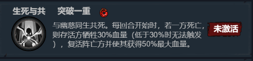 天赋生死与共:与幽慈同生共死。每回合开始时,若一方死亡,则存活方牺牲30%血量(低于30%时无法触发),复活阵亡方并使其获得50%最大血量。(有了该天赋便有了献祭流的阵容玩法,满足条件即可进行复活另外一方。)