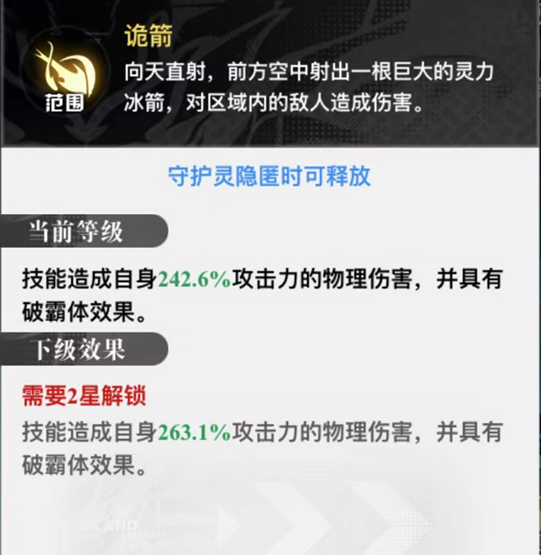 燕青的隐匿技诡箭:向天直射,前方空中射出一根巨大的灵力冰箭,对区域内的敌人造成自身242.6%攻击力的物理伤害,并具有破霸体效果。这个技能的射程和伤害范围很大,是清本的好帮手。