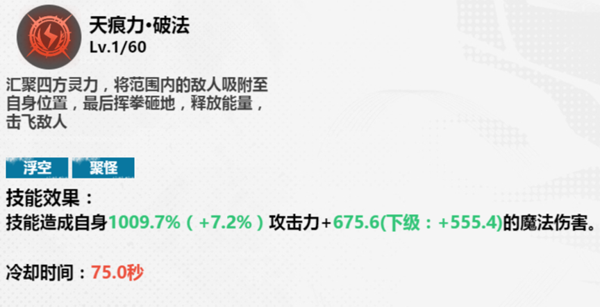 此技能非常有趣味性,气斗释放后,可以将范围内的敌人吸附至自身位置,最后给出一拳,将其击飞,造成大幅度伤害。冷却时间特别长,75秒,这就需要大家在实际作战之中掌握好时间了。
