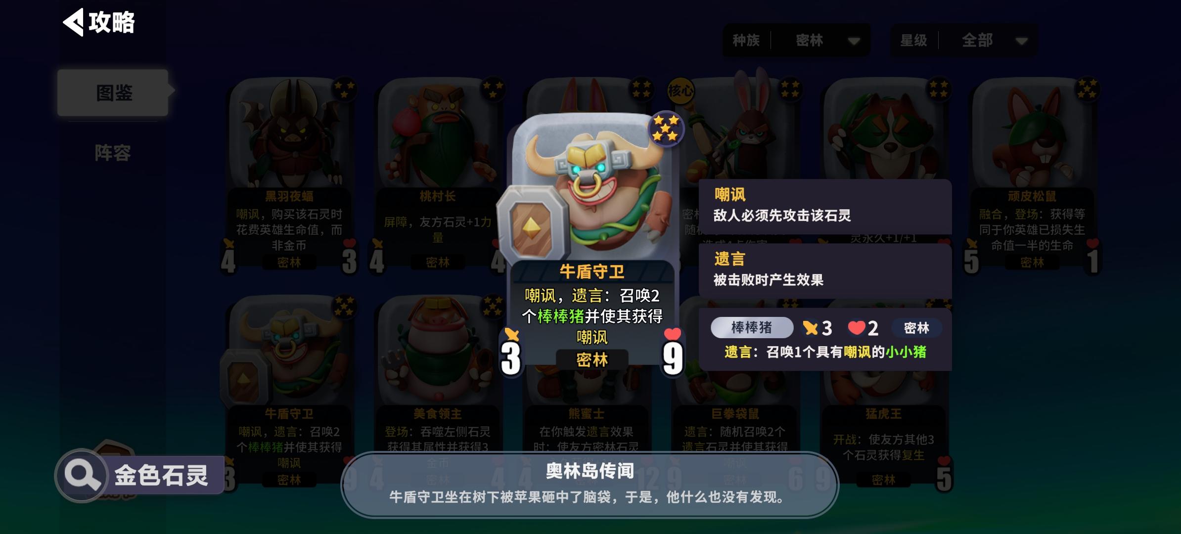 五本还是优先考虑牛盾守卫一个高频率的嘲讽,保证你的核心卡存活的同时增加全体密林身材。