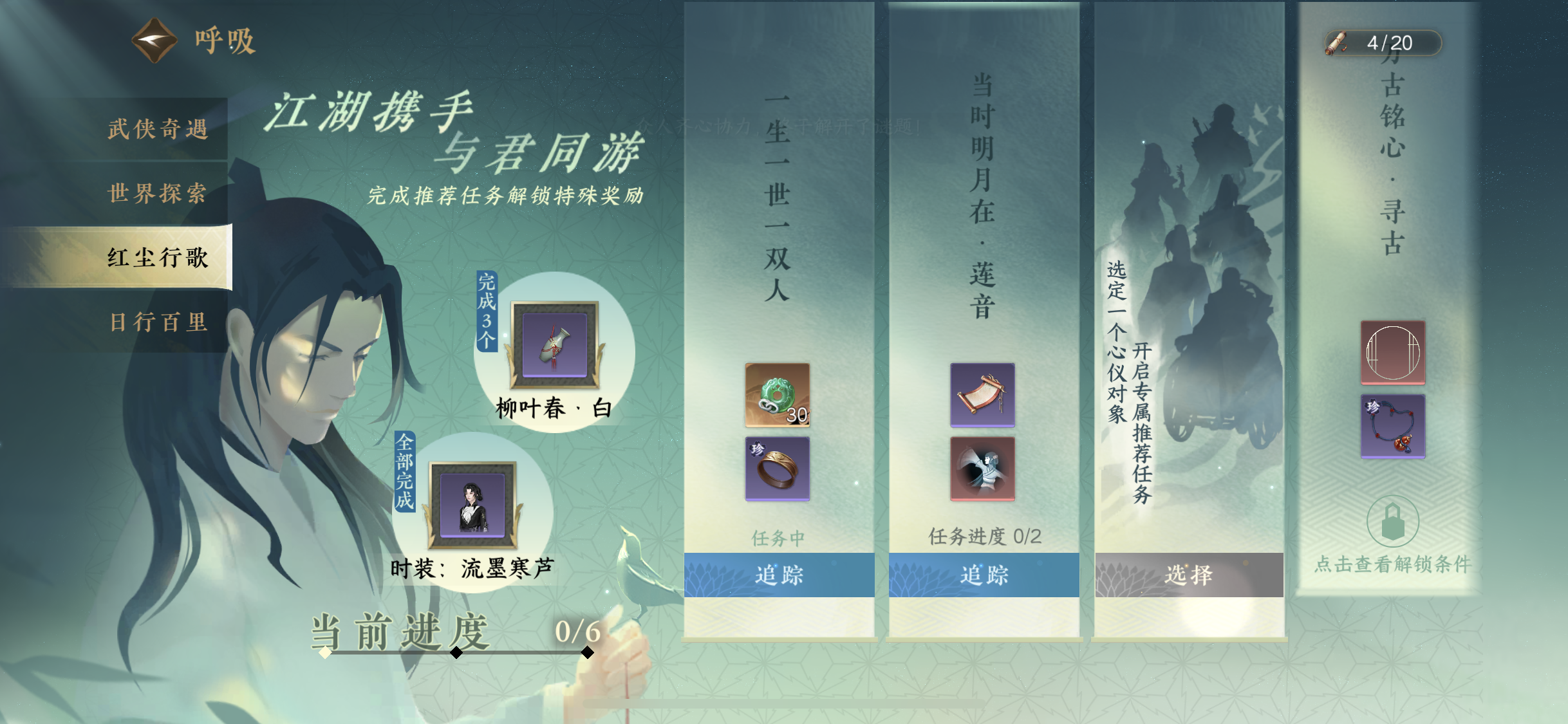获取方式:点开呼吸-红尘行歌,第三天会有选择NPC任务,选叶雪青会掉落54级独珍腰带;选择无情会掉落46级独珍鞋子【第一个任务完成,点击左上角,选择全部任务,江湖侠游里选择另一个NPC就可以梦回重做了】