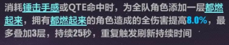 消耗锤击手感或QTE命中时,为全队角色添加一层都燃起来,都燃起来每层提高9%全伤最高3层,持续时间为25秒。