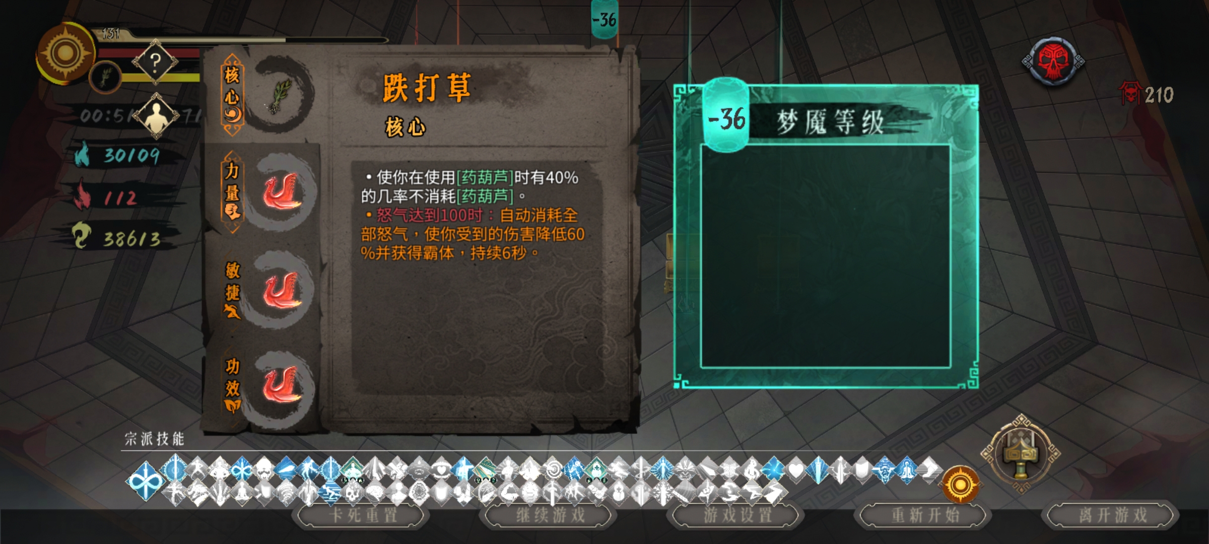 我们一般在第五层刷秘籍,把需要的秘籍刷出来,开局不是走火入魔的在这里刷走火,刷了走火的刷魂多势众(前期不要选不动如山),再说第一个大BOSS,一般都是直接秒的,所以在这里一般把贪恋诅咒刷出来。你要是遇见太阳和龙帝重开吧,刷诅咒太耗时间了。