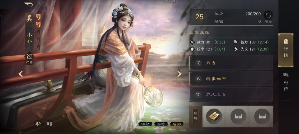 小乔战法:天香+料事如神+屈人之兵。韬略库:受到当前等级制约,只研读了励心善本。