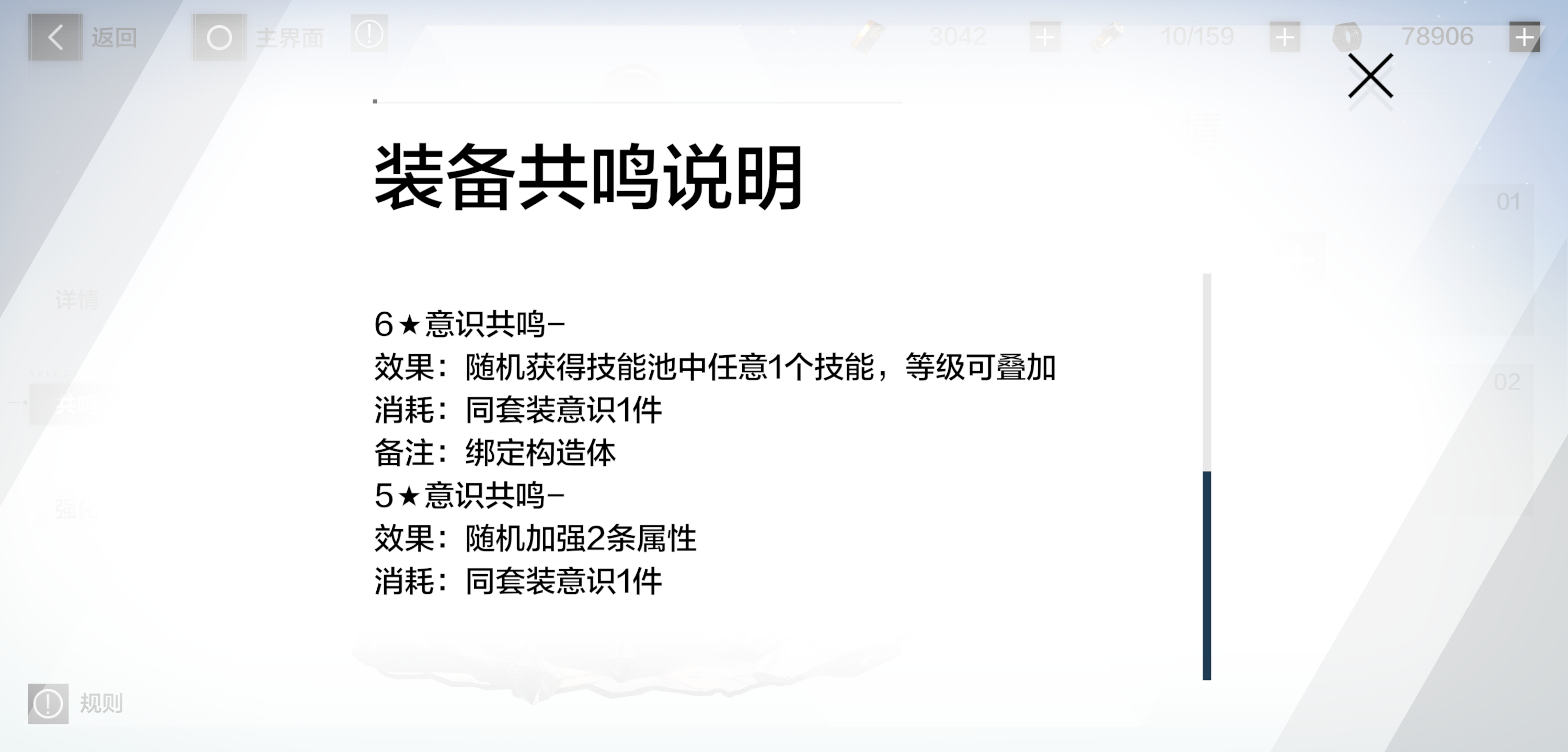 五星意识意识共鸣随机加强两条属性,消耗同套装意识一件。六星意识意识共鸣随即会的技能池种任意一个技能,消耗同套装意识一件或战区产出的六星意识自选材料,同时仅在装备在被绑定构造体时生效。稀有意识的产出开荒期到中期主要靠资源关作战补给AE-4,后期主要刷活动稀有意识关卡。