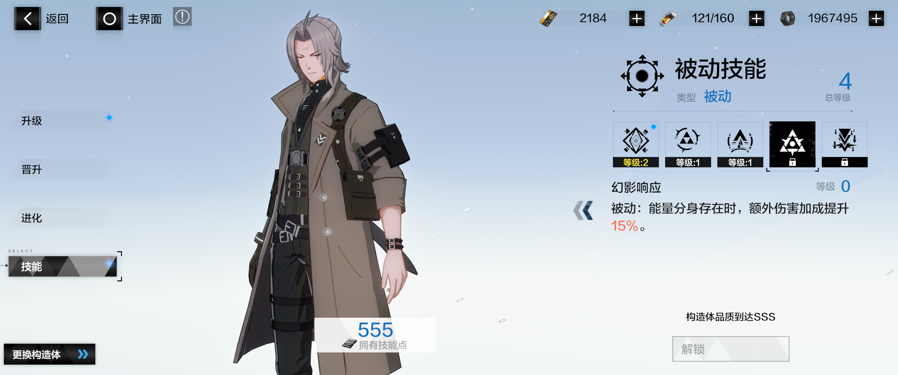 技能分为红色信号,黄色信号,蓝色信号,主动技能,被动技能五类,随着角色等级提高及稀有度提高解锁,升级消耗螺母和技能点。技能点开荒期和中期由资源关战技演习提供(版本活动期间且打的过活动关卡时可以用活动关卡掉落的材料兑换),后期由每日任务中的活跃度奖励提供。