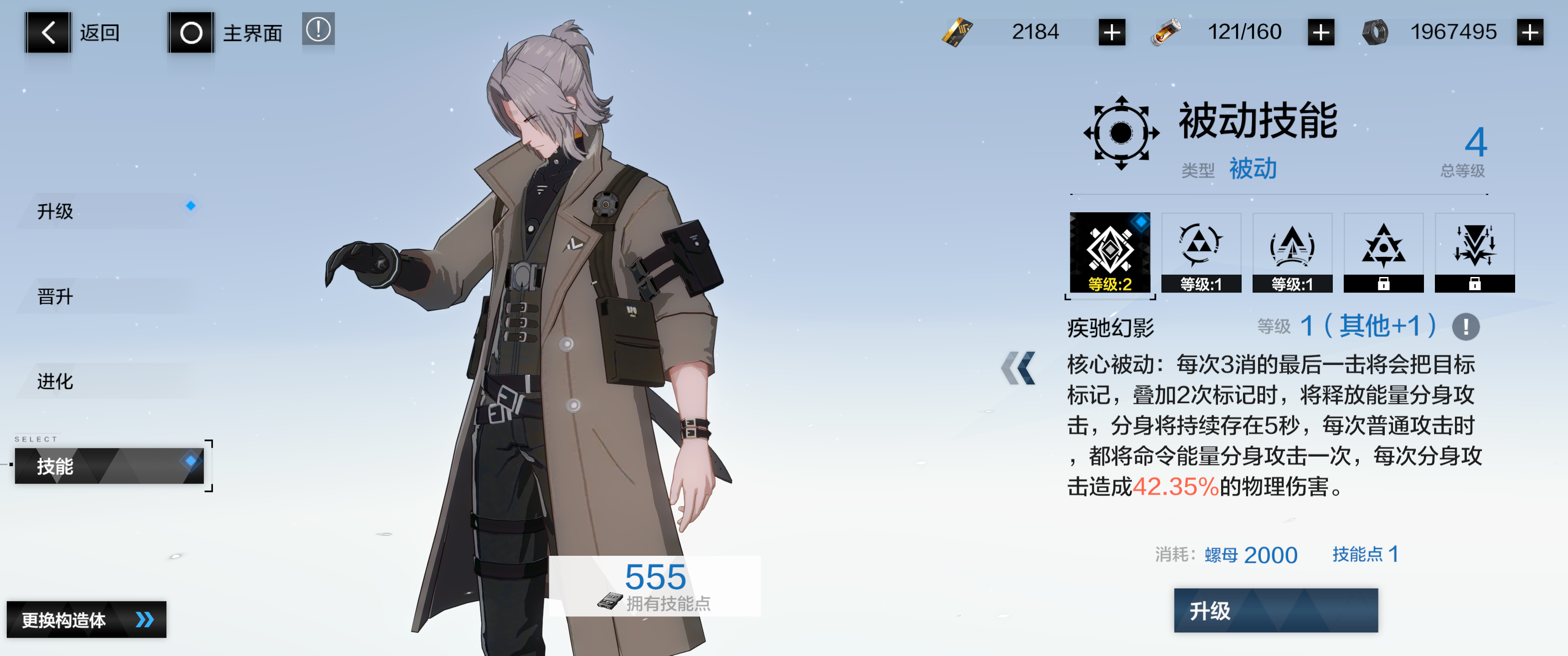 技能分为红色信号,黄色信号,蓝色信号,主动技能,被动技能五类,随着角色等级提高及稀有度提高解锁,升级消耗螺母和技能点。技能点开荒期和中期由资源关战技演习提供,后期由每日任务中的活跃度奖励提供。