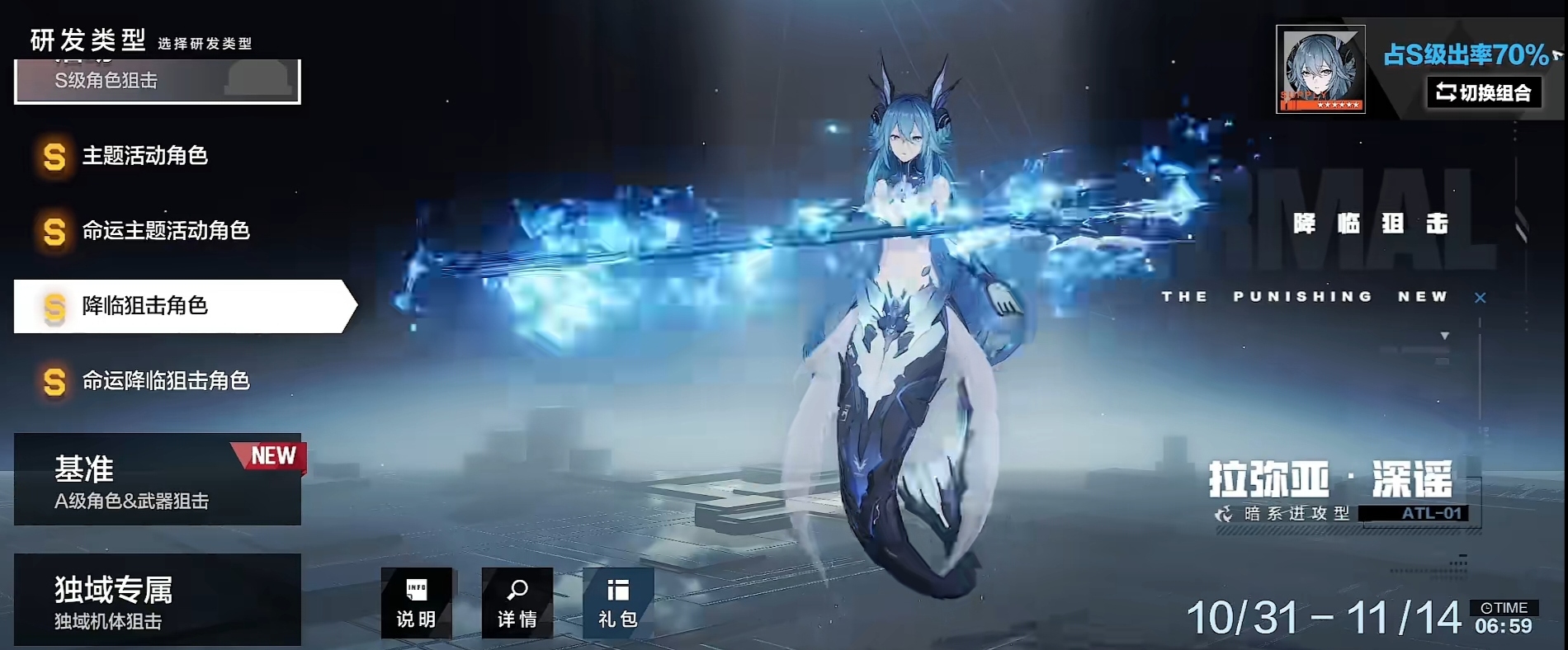 前期过渡:前期主要是推主线,解锁抽卡、资源本、新手手册等基础功能,目前通关主线剧情1-4之后会解锁疾雷手册,主要核心奖励为雷属性S角色露西亚·深红囚影和21号·森息及配套的武器、意识等,作为雷队代表性角色,新手前期开荒体验直接拉满,手册中还包含一个常驻的自选池疾雷研发,消耗1.5w黑卡拿一个截止七实·芒星之迹的S自选包(主要为了给11.7前没抽到七实芒星的玩家补齐雷队)