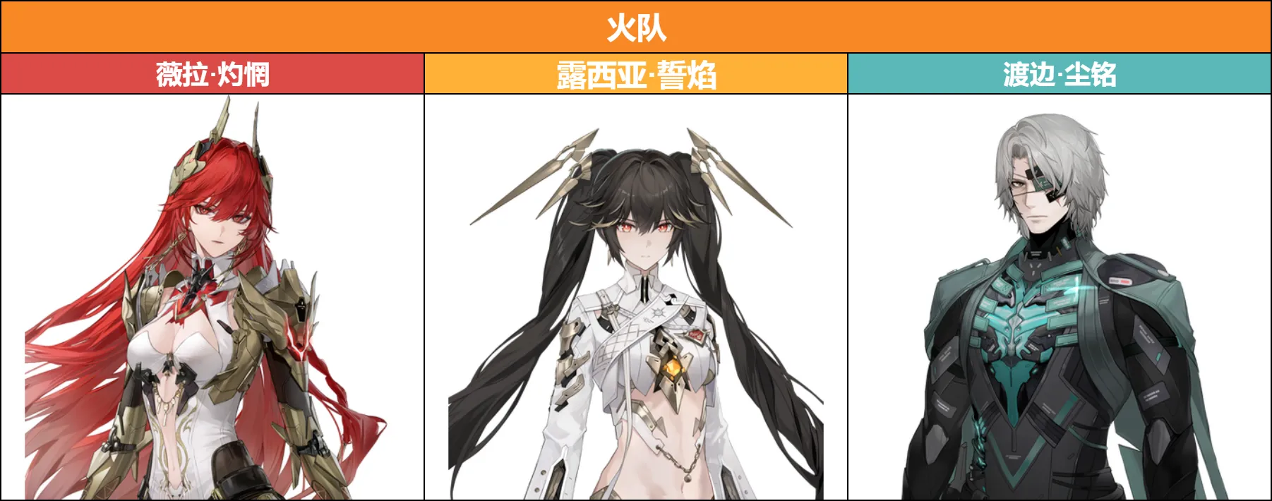 当前版本的火队中,誓焰、灼惘均具有较好的单C能力,玩家可以视自身的角色养成情况,确定队伍的主C。灼惘作为主C时,可以使用极昼替代誓焰。而尘铭提供的减抗较为重要,缺少尘铭时,选择布丽姬特·耀炎进行替代。