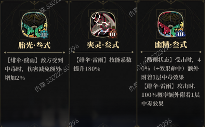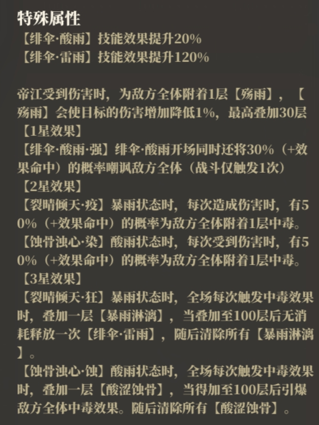 3星:「暴雨」状态时,每次「中毒」叠加一层「列晴倾天·狂」,100层无消耗释放一次「绯伞·雷雨」,清除全部层数;「酸雨」状态时,每次「中毒」叠加一层「列晴倾天·狂」,100层引爆全场「中毒」效果,随后清楚全部层数——两个效果都极大的提升了输出能力,让帝江在残局战斗中也拥有不俗的爆发伤害。