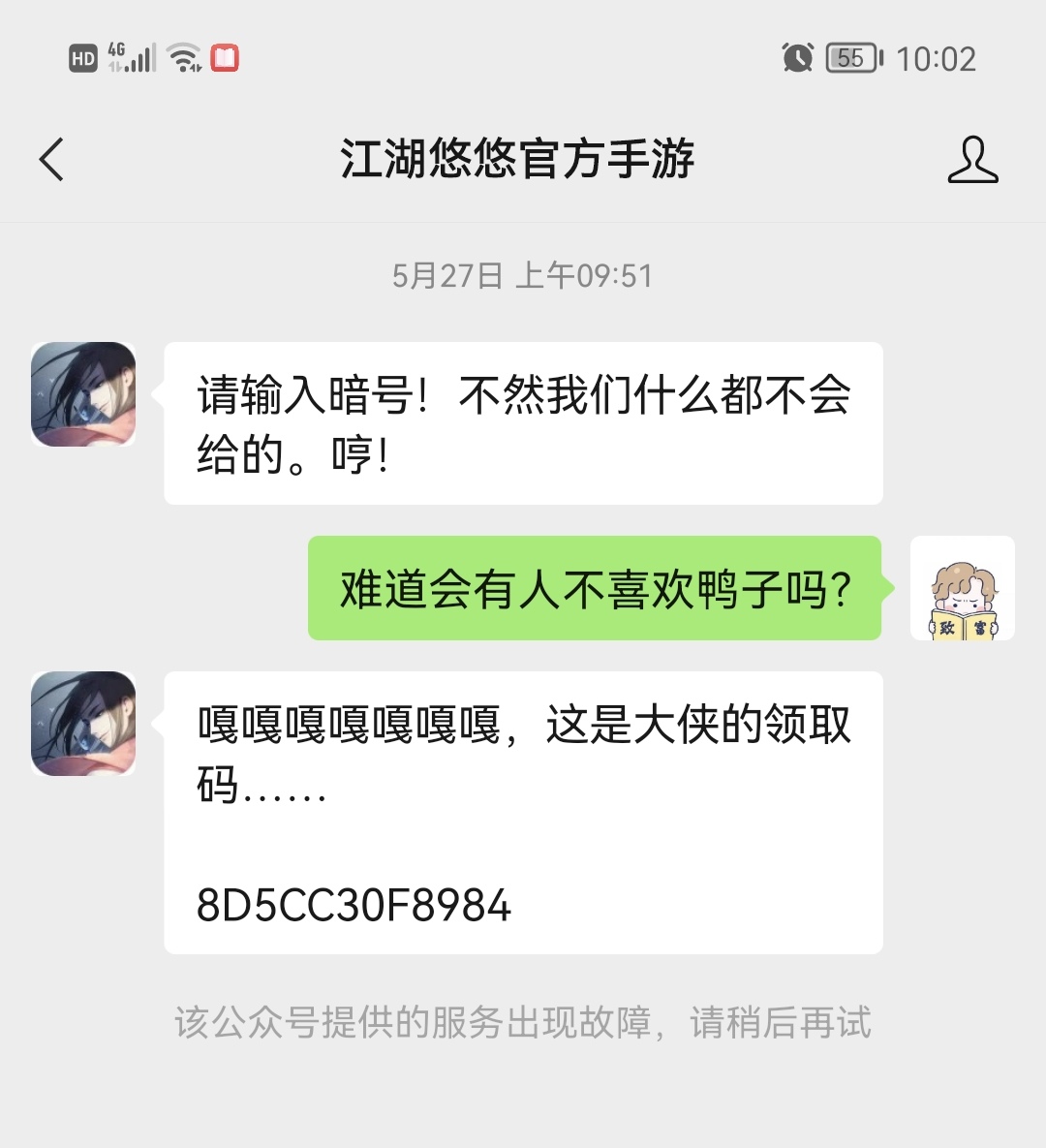 3.关注江湖悠悠微信公众号,输入暗号:难道会有人不喜欢鸭子吗?得一本随机上品武学