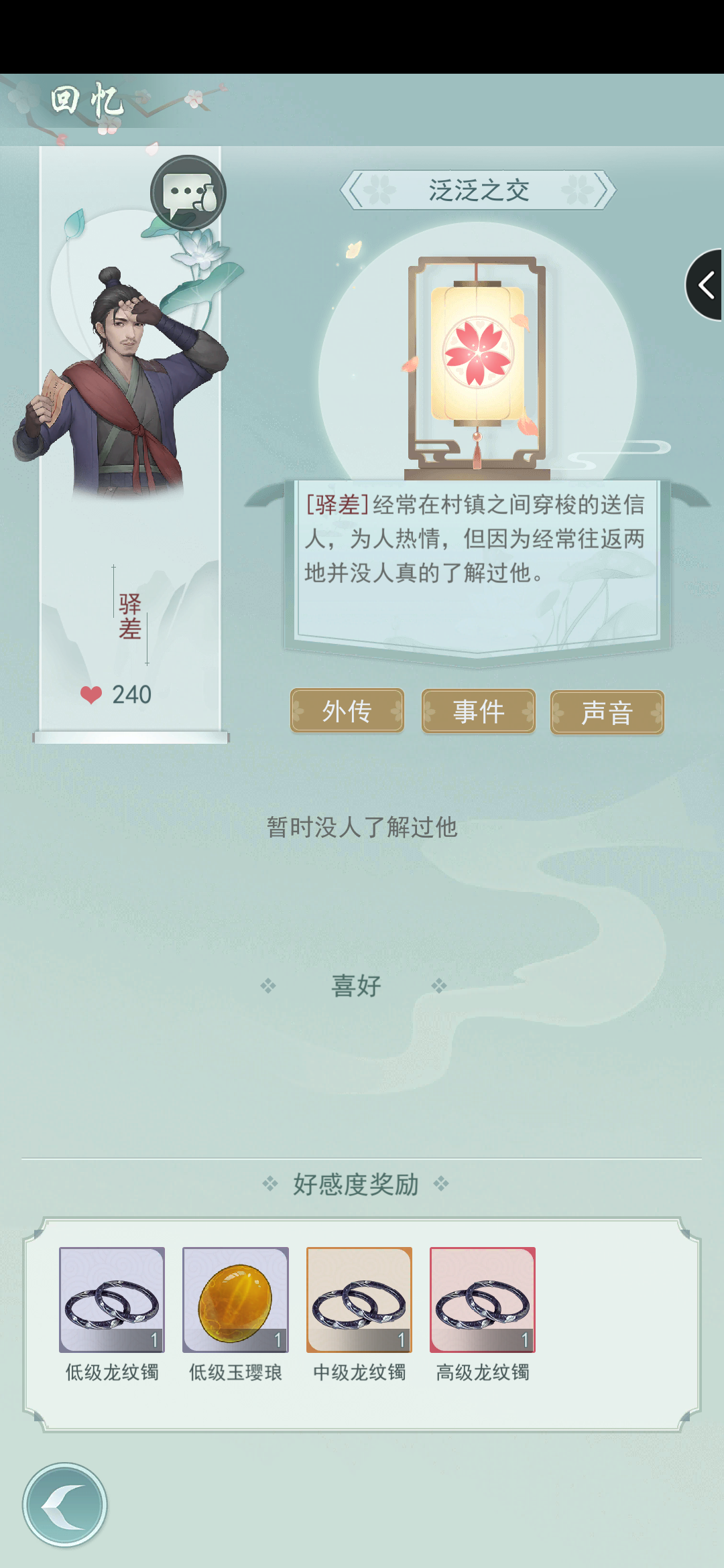 为了得到他的回礼(首饰),低级龙纹手镯需要500好感
