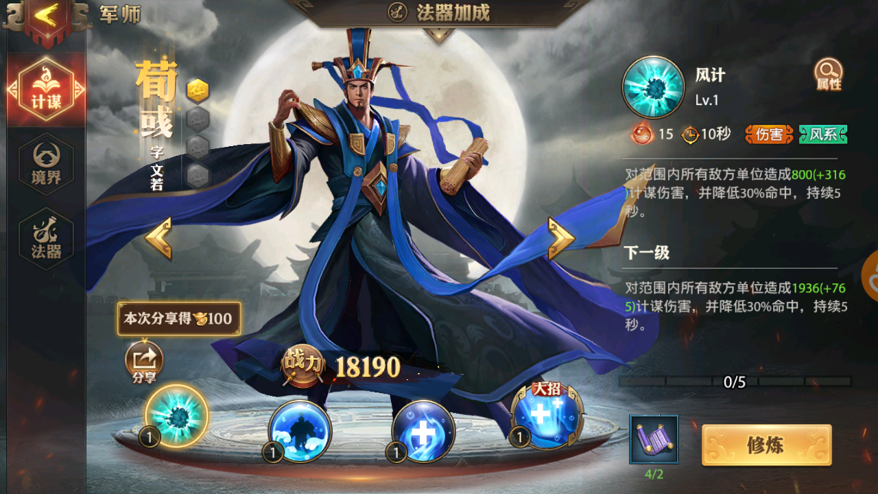 技能特点:全能通用型。基础技能有雷系控制、火系增益、风系减益,大招是火系伤害技能,法器能提高所有军事技能的灼烧伤害,几乎适应各种阵容。同时,水镜先生的晋升碎片可以从主线任务获得,也是所有军师里提升最快的一位。