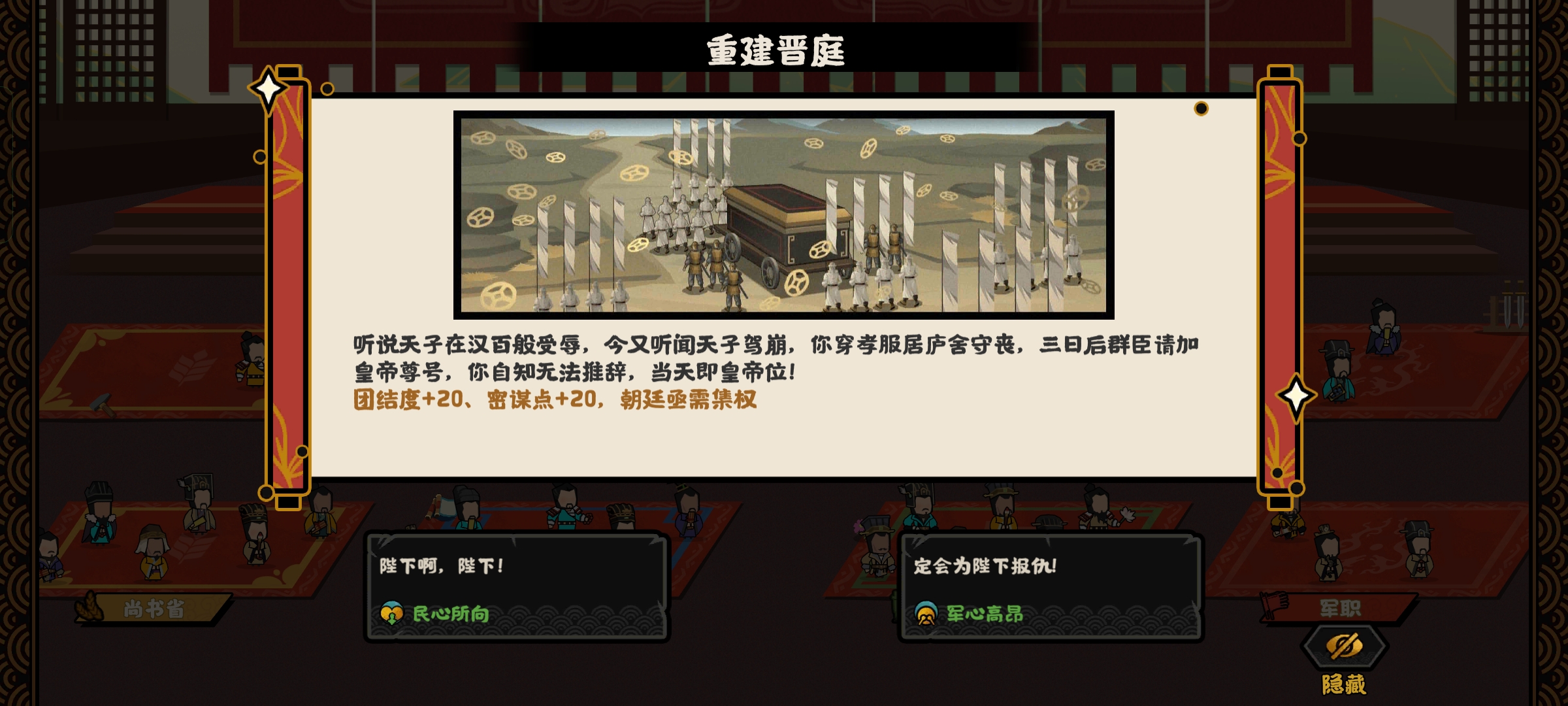 另外一个结局没有回合数限制这个好弄一点,可以不打仗一直朝会。