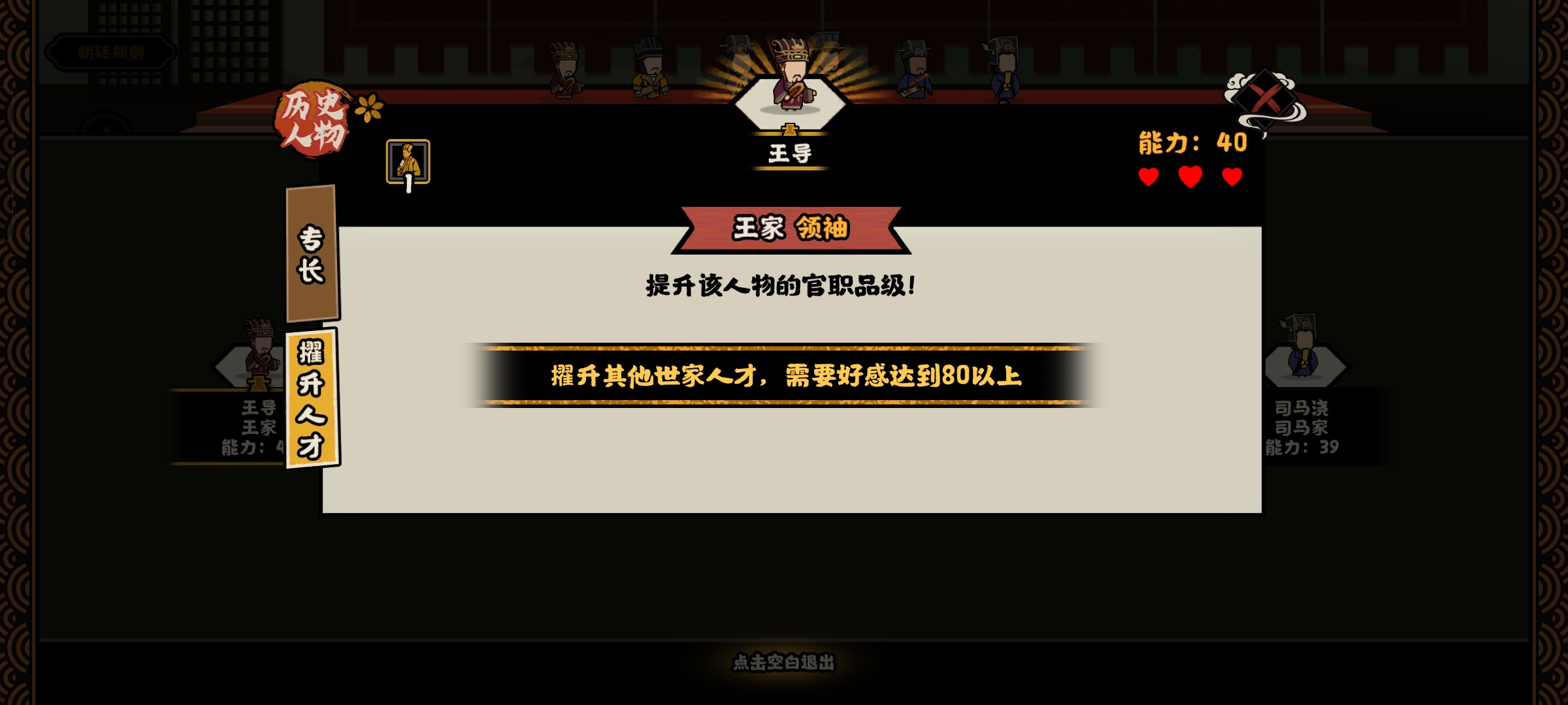 游戏里招到王导要80好感,我们开局就拉好感,捐赠卡牌直接给王导,招到之后王家势力大减。