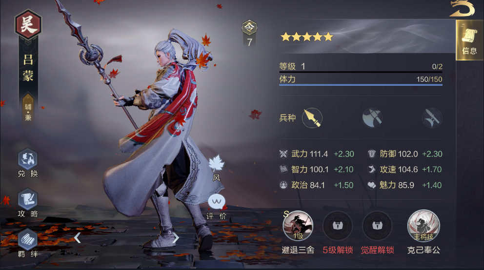 对2名敌方魅力最低的武将造成97.5智力伤害,对魅力低于自身的目标额外使其受到的智力伤害提高10%,持续10秒,反之本次伤害减半,技能冷却20秒。周瑜在历史上就是一个美男子,魅力很大的,这个人物在游戏中是唯一一个对魅力属性作战的人物,可以搭配貂蝉等人。