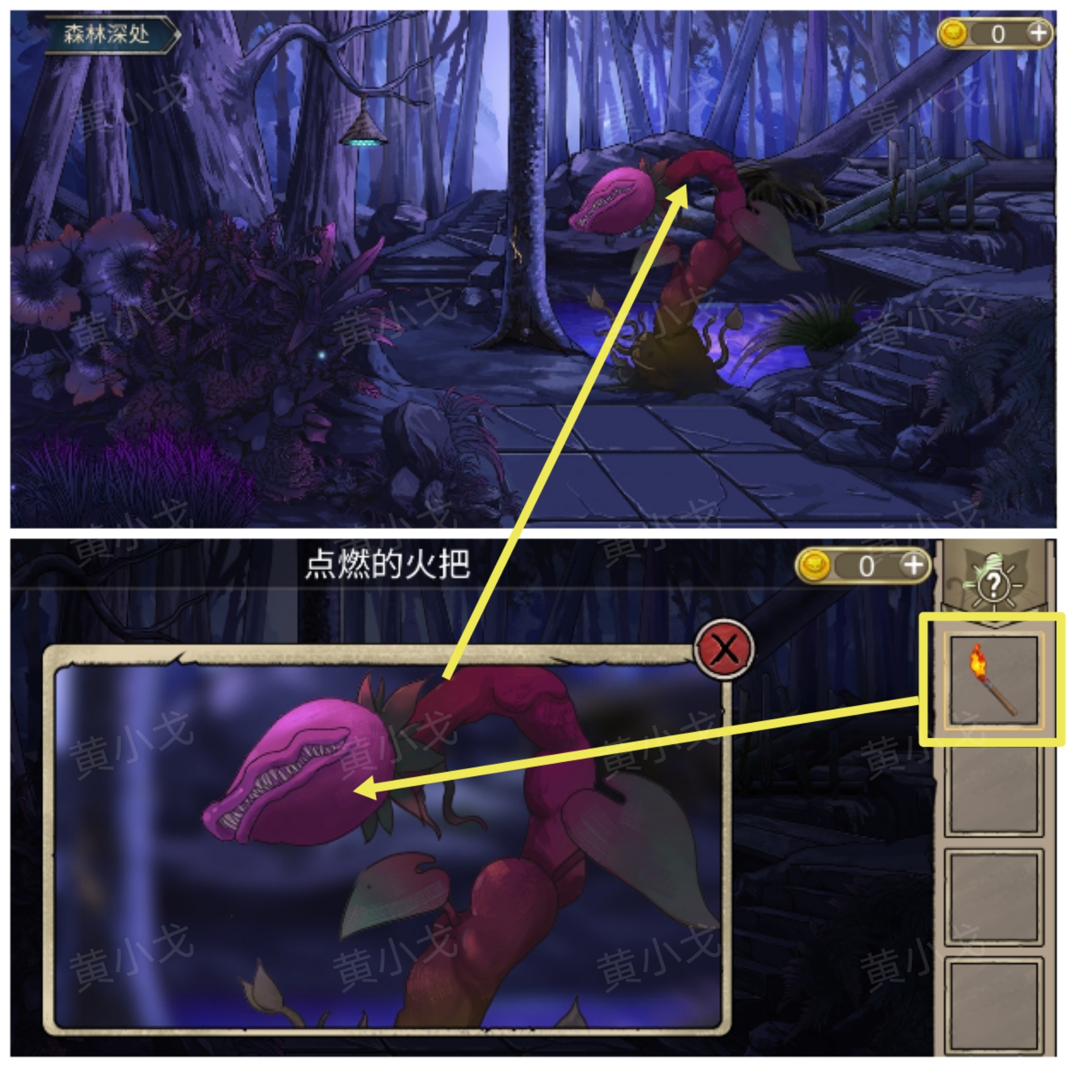 9.给【木棍】淋上【松油】,再用【火柴盒】里的火柴点燃,获得【点燃的火把】