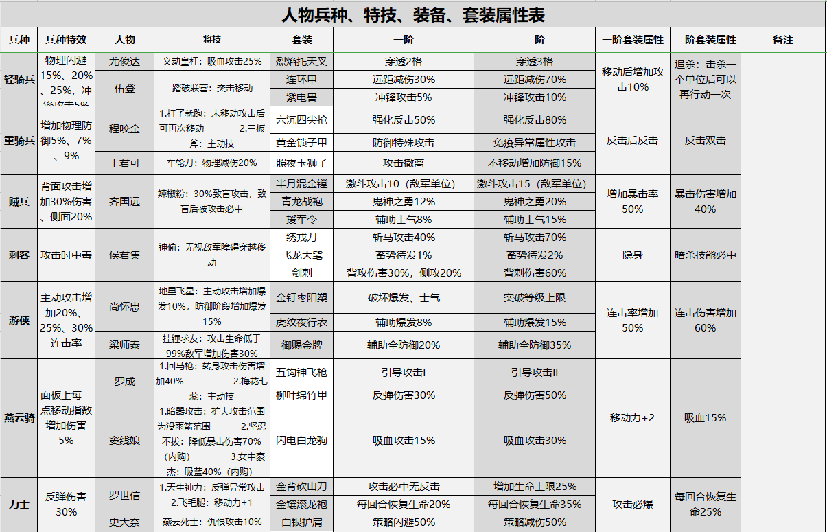 隋唐英杰传【隋唐干货】 人物兵种、特技、装备、套装属性表如下: