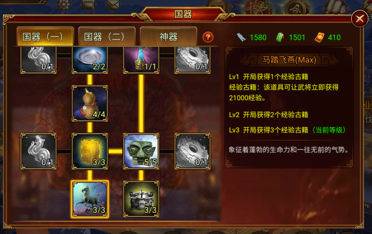 2.国器:尽快点到国器一最下面两个(中间能跳的就跳,能用礼券买的优先礼券加快速度 货币银铲消耗的地方)