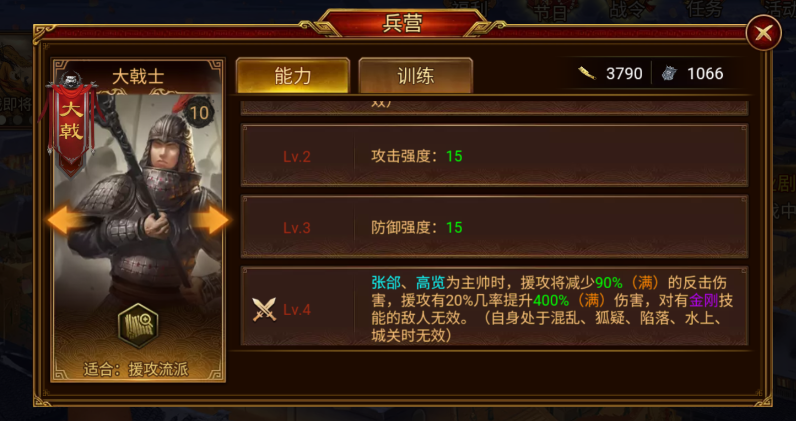 7.兵营:西凉拿了之后转大戟士(张郃牛逼)后无双,大戟士搭配虎卫援攻反伤为1点,点出来后玩剧本优先抓张郃,之后就是张郃时代