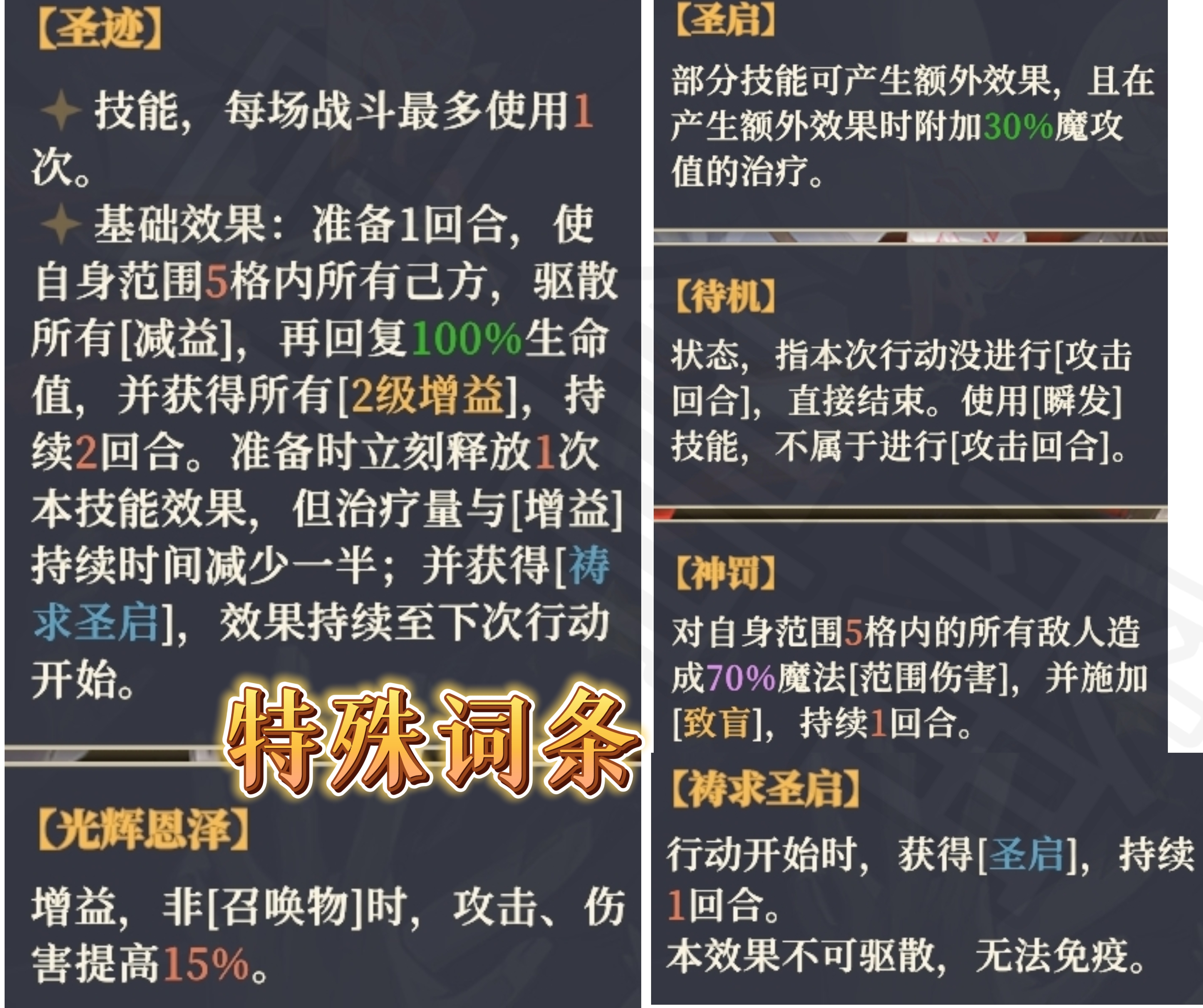 左边是大范围回血+攻击2+伤害2buff+光辉恩择,并且获得祷求【圣启】