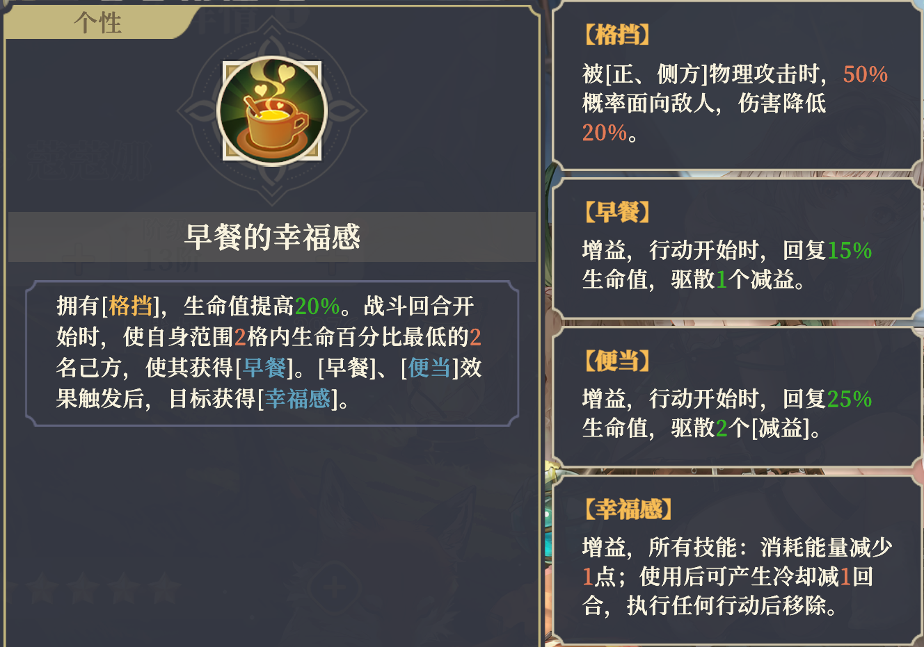 蔻蔻娜的个性和大招,分别能让她给己方施加名为[早餐]和[便当]的增益。[早餐]、[便当]效果触发后,目标有概率获得增益[幸福感],使所有技能消耗的能量减少1点,并减1回合的冷却。