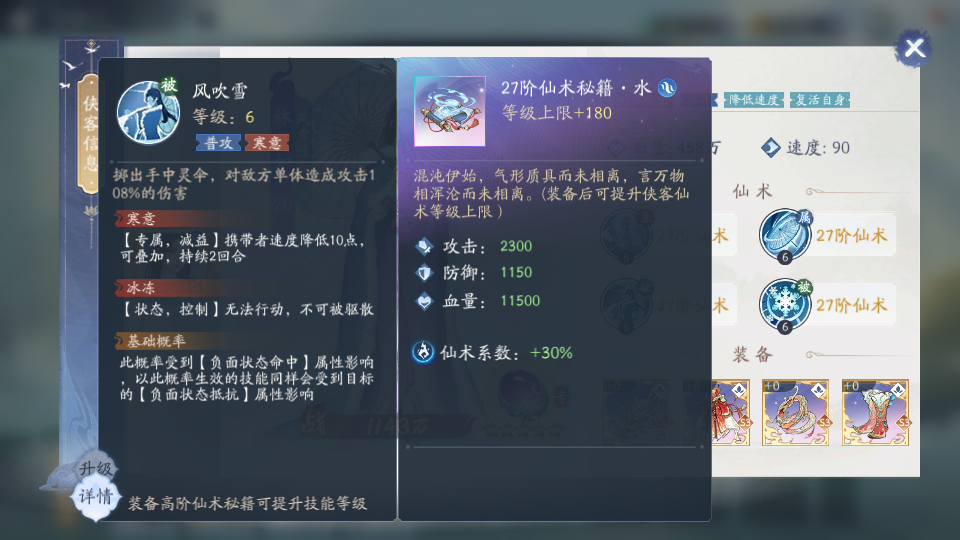 3技能普攻敌方速度最高的3个侠客,40%几率对目标附加“寒意”,持续2回合,若目标处于冰冻,“寒意”持续3回合。“寒意”是水林月如专属减益,降低携带者10点速度,持续2回合,可叠加。也就是说,敌方侠客将会越打越慢。